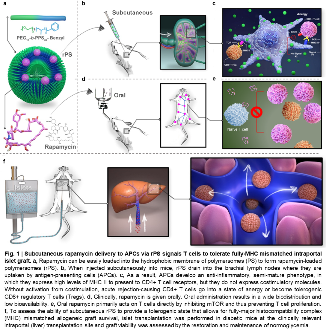 Rapamune® (oral rapamycin/sirolimus) administration is plagued by poor bioavailability, extensive fecal elimination, and wide biodistribution. Thus, this pleotropic mTOR inhibitor has a narrow therapeutic window, numerous side effects and provides inadequate transplantation protection. Parental formulation was not possible due to rapamycin’s hydrophobicity (log P 4.3). Here, we demonstrate that subcutaneous rapamycin delivery via poly(ethylene glycol)-b-poly(propylene sulfide)(PEG-b-PPS) polymersome (PS) nanocarriers modulates cellular biodistribution of rapamycin to change its immunosuppressive mechanism for enhanced efficacy while minimizing side effects (Fig. 1).