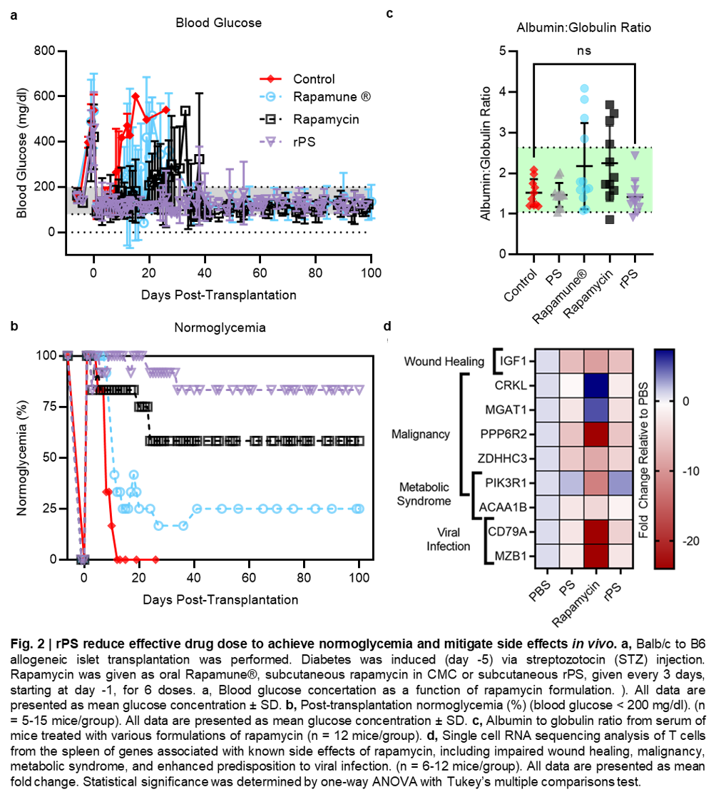 Subcutaneously administered rapamycin-loaded polymersomes (rPS) avoid fecal elimination and allow for sustained delivery of rapamycin to immune cell rich organs, especially the axillary lymph nodes. While oral rapamycin inhibits naïve T cell proliferation directly, rPS instead modulated Ly-6Clow monocytes and tolerogenic semi-mature dendritic cells, with immunosuppression mediated by CD8+ Tregs and rare CD4+ CD8+ double-positive T cells. As PEG-b-PPS PS are uniquely non-inflammatory, background immunostimulation from the vehicle was avoided, allowing immunomodulation to be primarily attributed to rapamycin’s cellular biodistribution. Repurposing mTOR inhibition significantly improved maintenance of normoglycemia in a clinically relevant, MHC-mismatched, allogeneic, intraportal (liver) islet transplantation model (Fig. 2a,b). Importantly, rPS treatment does not alter serum albumin:globulin ratios (Fig. 2c).