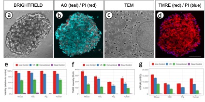 Results: Following rewarming, three-hour recovery in a dynamic spinner flask with culture media at 5% CO2 was essential. Viability of 91% was achieved with VR, compared to 59% using conventional cryopreservation methods. ATP content, mitochondrial reactivation, OCR, GSIS demonstrated significant difference compared to conventional cryopreservation in all 4 species. Brightfield and TEM imaging show well preserved cellular architecture. 9/10 VR transplants (250 islets) normalized BG in 48h with tight control of BG thereafter for >100 days with acceptable responses to glucose stress tests, while insulin production of pig & HSc VR xenografts were comparable to control xenotransplants.