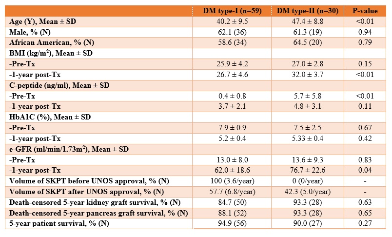 Methods: We conducted a retrospective chart-review study on SKPT patients from Jan 2010 to Nov 2020 and collected data on patient demographics such as age, gender, and race. BMI, c-peptide, HbA1c, and e-GFR were noted pre-transplant and 1-year post-transplant. Outcome variables included volume of SKPT pre-and post-approval of SKPT for type-II DM patients, death-censored 5-year pancreas and kidney graft survival, and 5-year patient survival. Student’s t-test for continuous variables, Chi-square test for categorical variables, and Mantel-Cox test for survival analysis was done using SPSS.