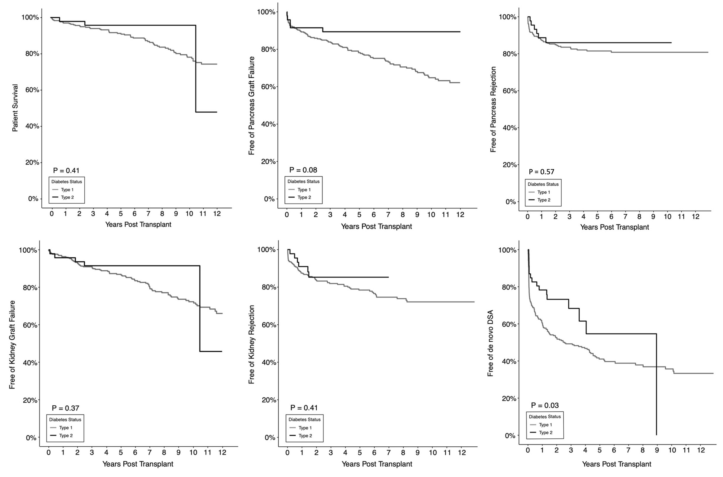 Results: Demographic variables were statistically significantly different (SSD) in T1D (n=298) vs T2D (n=47) recipients. There was no SD in outcome-free survival regarding patient or GS (pancreas or kidney) or BPR or other outcomes (Figure 1 and 2). The risk of BPR of either graft was not SD between T2D and T1D recipients (HRpancreas = 1.04, p = 0.93; HRkidney = 0.96; p = 0.93). T2D demonstrated a significantly higher dnDSA-free survival (p = 0.03) though there was no SD between the two types on multivariate analysis (HR = 0.70, p = 0.20). Interestingly, higher BMI was associated with lower risk of pancreas BPR (HR = 0.90, p = 0.01), de novo DSA (HR = 0.95, p = 0.02), UTI (HR = 0.95, p = 0.04) and thrombosis (HR = 0.88, p = 0.02). Compared to basiliximab, alemtuzumab was associated with lower risk of de novo DSA (HR = 0.38, p <0.01), while antithymocyte globulin was associated with a lower risk of kidney BPR (HR = 0.40, p = 0.04). There was no SD between T2D and T1D SPKT regarding readmissions (HR = 0.77, p = 0.25), infections (HR = 0.77, p = 0.18), major surgical complications (HR = 0.89, p = 0.79) or thromboses (HR = 0.92, p = 0.90).