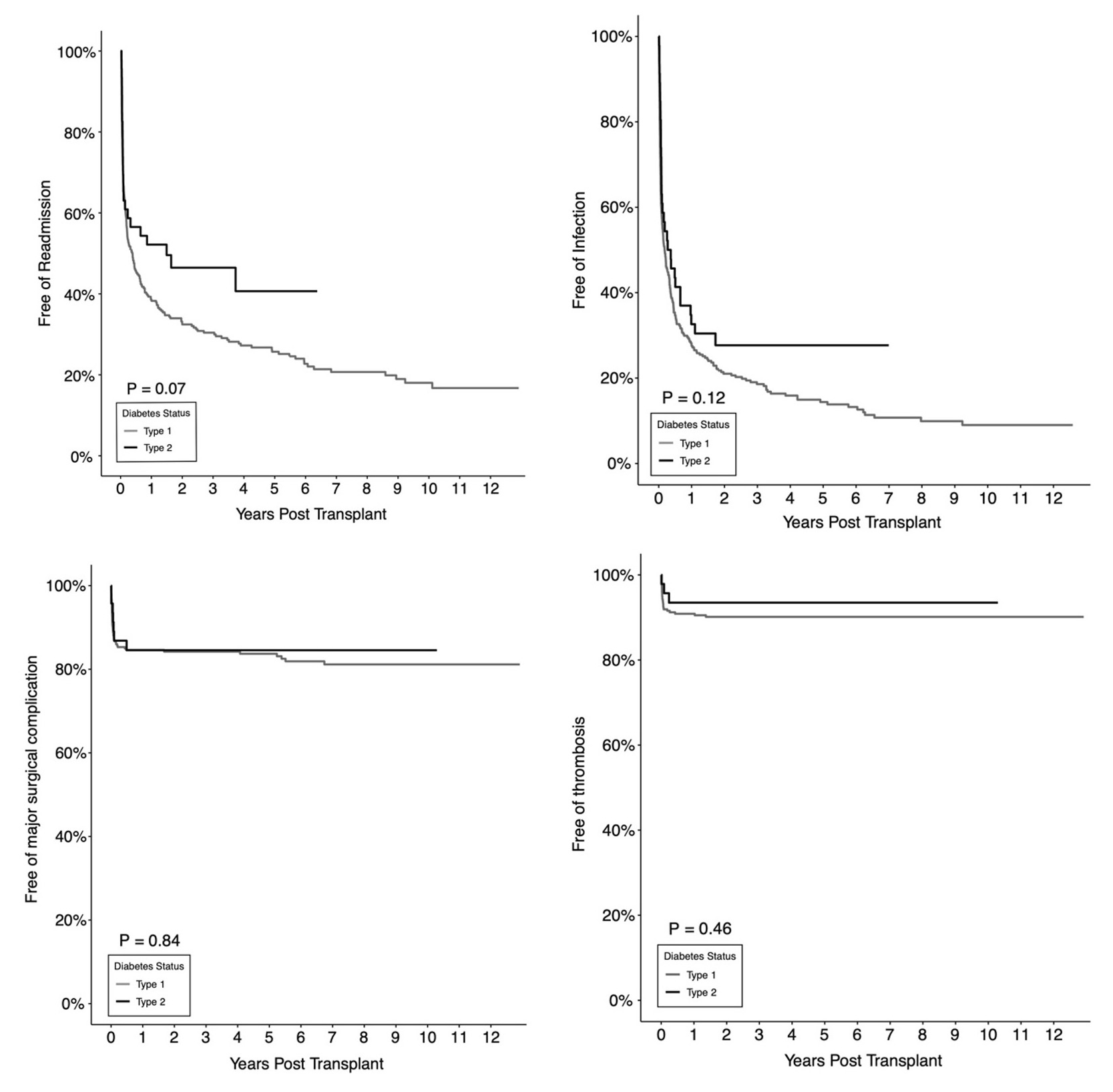 Conclusions: In conclusion, BPR, infections, and surgical complications after SPKT are not significantly worse in T2D compared to T1D recipients supporting the position that T2D status should not restrict possible SPKT candidacy.