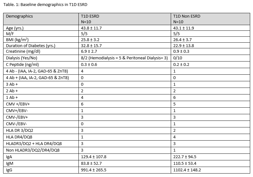 Methods: After IRB approval, we prospectively studied immune cells by flow cytometry in 20 subjects in 2 groups: T1D ESRD, T1D Non ESRD. Each group had 10 subjects who were age and gender matched. We collected baseline C-peptide, Auto antibodies, duration of diabetes, CMV/EBV, HLA and dialysis data. T cell assessments included quantitative immunophenotyping of CD4 and CD8 T cells and their subsets.