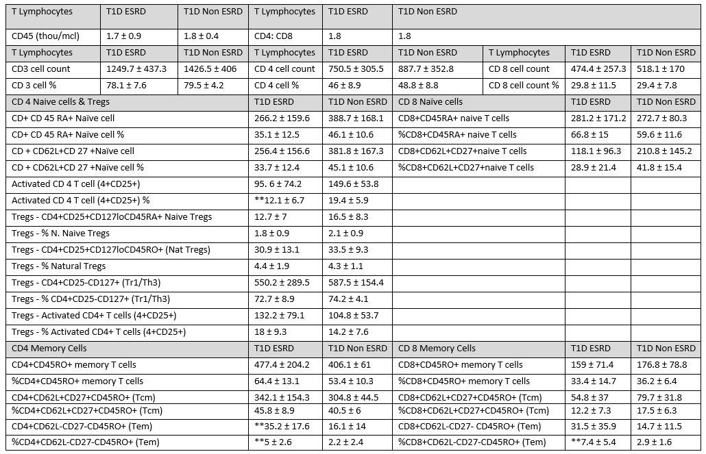 Results: Detailed baseline demographics of the two groups are shown under Table 1. T cell subsets showed significant differences (Table 2) in CD4+CD62L-CD27-CD45RO (Tem) cell count (p value: 0.027) and percentages (p value 0.036); Activated CD4 T cell (4+CD25) cell % ( p value: 0.032) , CD8 +CD62L-CD27-CD45RO+ (Tem) cell % (p value: 0.041 )in T1D ESRD Vs. T1D Non ESRD. The increased CD4 and CD8 effector memory T cells (Tem) in the T1D ESRD patients points to a higher likelihood of perhaps ongoing inflammation since active infection was excluded at the screening visit.