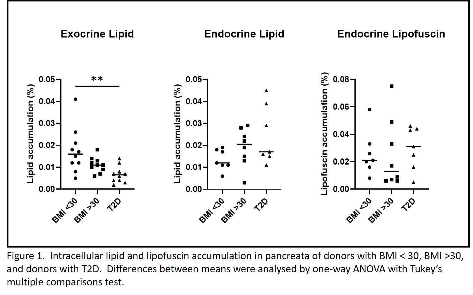 Method: Biopsies of human pancreata were collected in a standardised manner as part of the Quality in Organ Donation (QUOD) Expand project, processed, and imaged with TEM as previously described (Kattner et al 2020). A cohort of 15 donors including five without diabetes with body mass index (BMI) <30 kg/m2, five without diabetes with BMI>30 kg/m2 and five with T2D were analysed. Donors were matched for age, gender, and cold ischaemia time. Acute impact on acinar and endocrine cells was assessed using the novel Newcastle Pancreatic Acinar/Endocrine Scoring Systems (NPASS/NPESS). Additionally, measurement of intracellular lipid and lipofuscin accumulation was carried out using ImageJ.