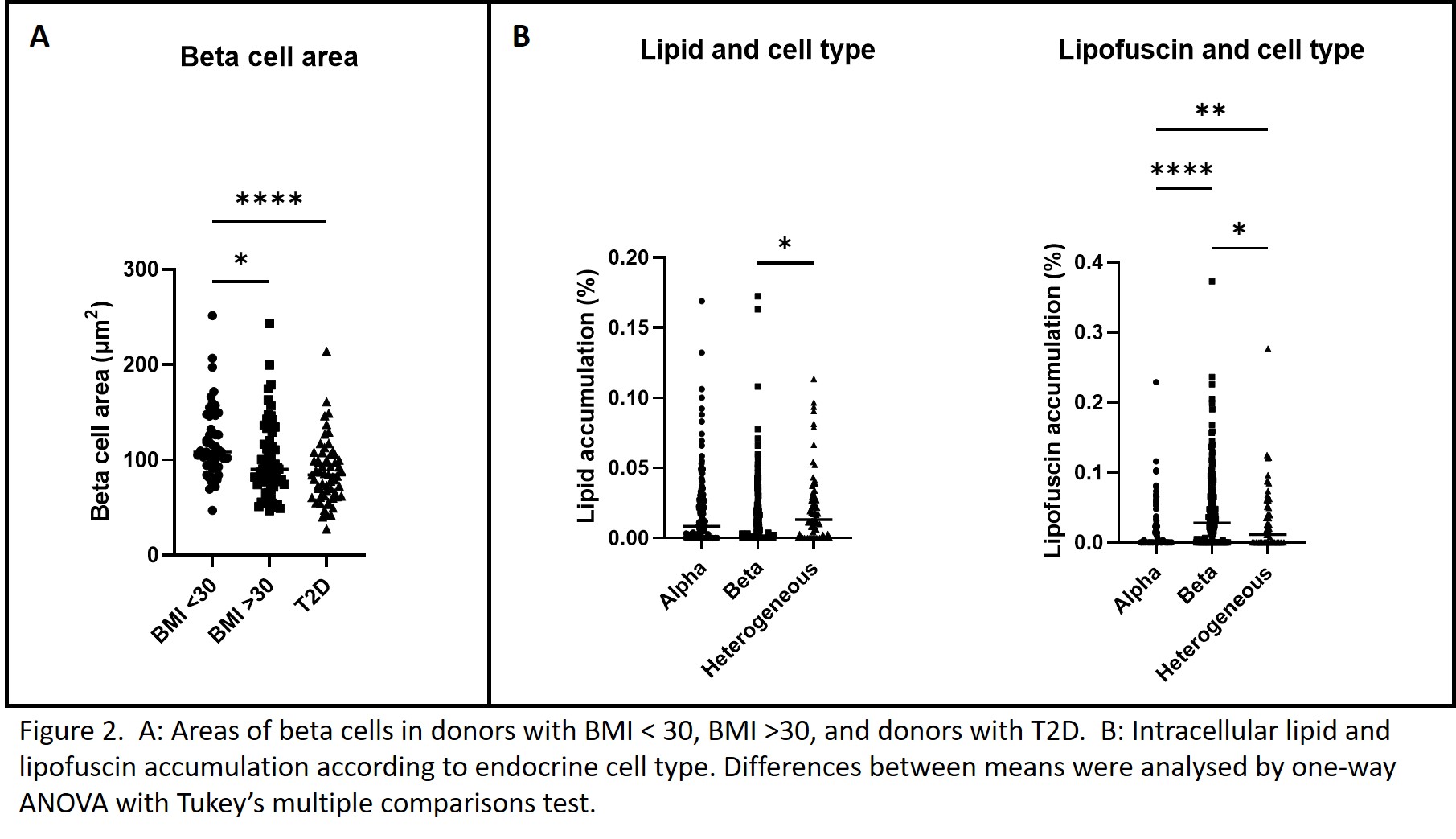 Discussion: Obesity and T2D had little acute impact on the sub-cellular ultrastructure of pancreatic cells, but were associated with alterations in intracellular lipid accumulation, with no evidence of increased β-cell turn-over (i.e. no reduction in lipofuscin accumulation). Heterogeneous cells suggestive of a transitional phenotype between α- and β-cells appeared to be of intermediate ‘age’ (lipofuscin) and more prone to lipid accumulation. Further understanding of the mechanisms leading to the changes observed here may deepen our understanding of islet dysfunction in T2D and lead to new therapeutic interventions.