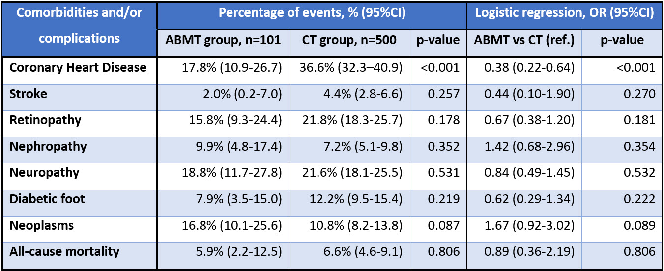 Methods: The initial cohort of 102,611 patients who were admitted to the hospital with DM were identified using ICD-10 codes through UNEHS between 2014-2019. Out of them, 101 patients who underwent ABMT were defined using ICD-9 procedure codes. Mortality data and patient-related demographics were linked from the National Population Registry. Identified datasets were cross-checked with the whole UNEHS dataset (n=1,565,093 observations) to ascertain the following complications/comorbidities: coronary heart disease (CHD), stroke, retinopathy, nephropathy, neuropathy, diabetic foot, neoplasms. Based on patients’ baseline characteristics (age, sex, duration of DM, residency, ethnicity, number of hospitalizations, and type of diabetes), the cohort of ABMT patients (n=101) matched with a cohort of CT patients (n=102,611) with a 1:5 ratio by propensity score matching (PSM). The final cohort of 601 patients (101 with ABMT vs 500 with CT) was further evaluated.