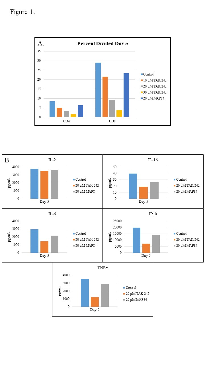 Methods: Human peripheral blood mononuclear cells labeled with carboxyfluorescein succinimidyl ester were tested for proliferation in a one-way mixed lymphocyte reaction against mitomycin treated, CellTrace Violet-labeled allogenic splenocytes as stimulators. Proliferation of CD4+ and CD8+ T cells was analyzed by flow cytometry. Concentrations of pro-inflammatory cykokines in the culture supernatant was measured by Luminex Multiplex Bead Assay. Varying concentrations (0-30 µM) of TAK242 or MAP84, an inactive structure analog of TAK242, were added to the culture medium.