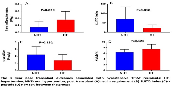 Results: Out of 21 TPIAT patients, 8 (38%) had pre-op hypertension or were on hypertension medication before the start of the TPIAT procedure. There was no significant difference in the IEQ/g of the pancreas (5688±631.4 vs 4416±836.8 IEQ/g of the pancreas, p=0.274) and the islet transplant dose (5442±714 vs 4074±974 IEQ/kg of the recipient, p=0.244) between the NHT and the HT group. There is no difference in the patient’s characteristics including BMI, disease duration, pain and pancreas fibrosis score, pretransplant recipients HbA1c% and c-peptide levels between the HT and NHT group. The statistical analysis showed, TPIAT patients with pre-OP HT required a significantly higher amount of exogenous insulin posttransplant (0.36±0.09 vs 0.14±0.04 p=0.029) and also, achieved poor beta-cell function as calculated by the SUITO index (23.36±7.3 vs 70.24±18.4, p=0.018) compared to the NHT group after 1-year post-TPIAT (fig:A&B). There was no significant difference in the post-transplant c-peptide (1.4±0.3 vs 2.2±1.4, p=0.132), and HbA1c (7.46±0.7 vs 6.4±0.2, p=0.125) compared to the NHT group (fig:C&D).