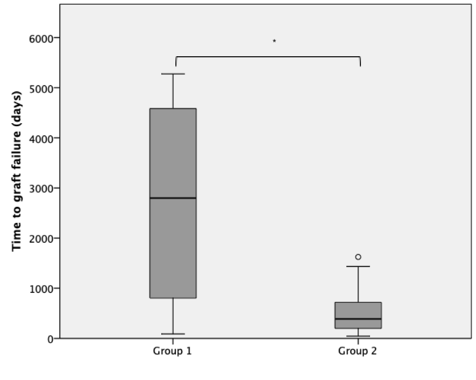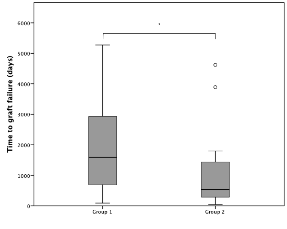 Results: Group 1 subjects (n=25) were aged 41.5 ± 8.4 years and Group 2 subjects (n=22) 45.9 ± 7.3 years (P= 0.062). Female recipient frequency was 44.8% (n=13) in Group 1 and 55.2% (n=16) in Group 2 (P=0.145). Group 2 developed graft failure earlier than Group 1 [680 (286 – 1624) vs. 1906 (756 – 3256) days, P= 0.038, Figure 1].