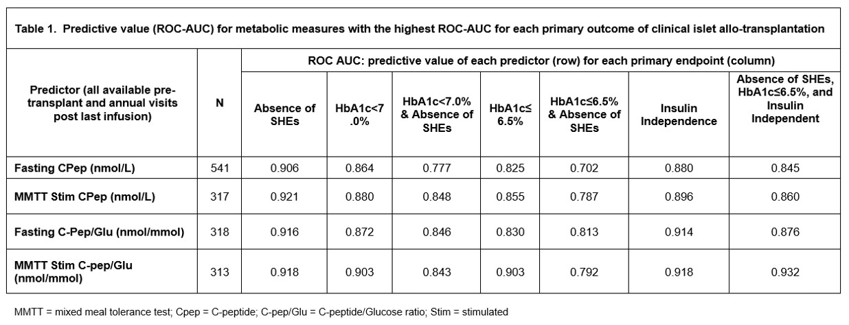 Methods: Collaborative Islet Transplant Registry (CITR) Islet-Alone recipients with pre-transplant C-peptide <0.1 nmol/L and mean follow up of 4.6±1.1 years were included in the analyses (n=677). Post-transplant metabolic measures obtained from arginine stimulation test, IVGTT, OGTT, glucagon stimulation test and mixed meal stimulation test (MMTT) were evaluated. Predictive value of these measures for 7 primary outcomes of clinical ITx (i.e., absence of SHEs (ASHE); HbA1c<7.0%; HbA1c <7.0% & ASHE; HbA1c≤6.5; HbA1c≤6.5% & ASHE; insulin independence; and ASHE, HbA1c≤6.5%, and insulin independence) was assessed by area under the curve of receiver-operator characteristics curves (ROC-AUC). Measures with the highest ROC-AUC were then selected for determination of optimal cut points by ITx outcome.