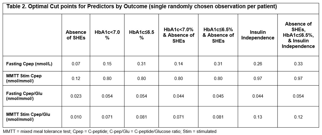 Results: Fasting C-peptide, MMTT stimulated C-peptide, fasting C-peptide to Glucose (Cpep/Glu) ratio, and MMTT stimulated Cpep/Glu ratio showed the highest ROC-AUCs among all measures evaluated (Table 1). Fasting C-peptide was highly predictive for ASHE (ROC-AUC = 0.9228; optimal cut point = 0.07 nmol/L), and the composite outcome of ASHE, HbA1c≤6.5%, and insulin independence (ROC-AUC = 0.8456; optimal cut point = 0.33 nmol/L) (Table 2). However, MMTT stimulated Cpep/Glu ratio outperformed both fasting and stimulated C-peptide for all outcomes except ASHE alone. Optimal cut point for the ideal composite outcome of ASHE, HbA1c≤6.5%, and insulin independence was 0.12 nmol/mmol for the MMTT stimulated Cpep/Glu ratio, and 0.97 nmol/L for MMTT stimulated C-peptide (Table 2).